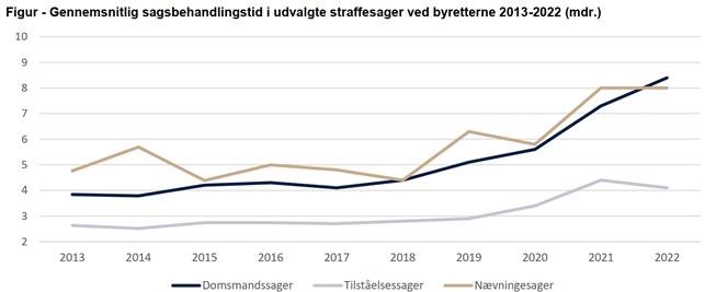 Særligt i straffesager steg den gennemsnitlige sagsbehandlingstid i 2022 ved byretterne. Mens sagsbehandlingstiderne i nævningesagerne faldt marginalt, steg sagsbehandlingstiden for domsmandssager, der er blandt de alvorligste straffesager, fra 7,3 måneder i 2021 til 8,4 måneder i 2022. I 2018 tog det gennemsnitligt byretterne 4,4 måneder at gennemføre en domsmandssag. I 2022 var det steget til 8,4 måneder, det vil sige næsten en fordobling.