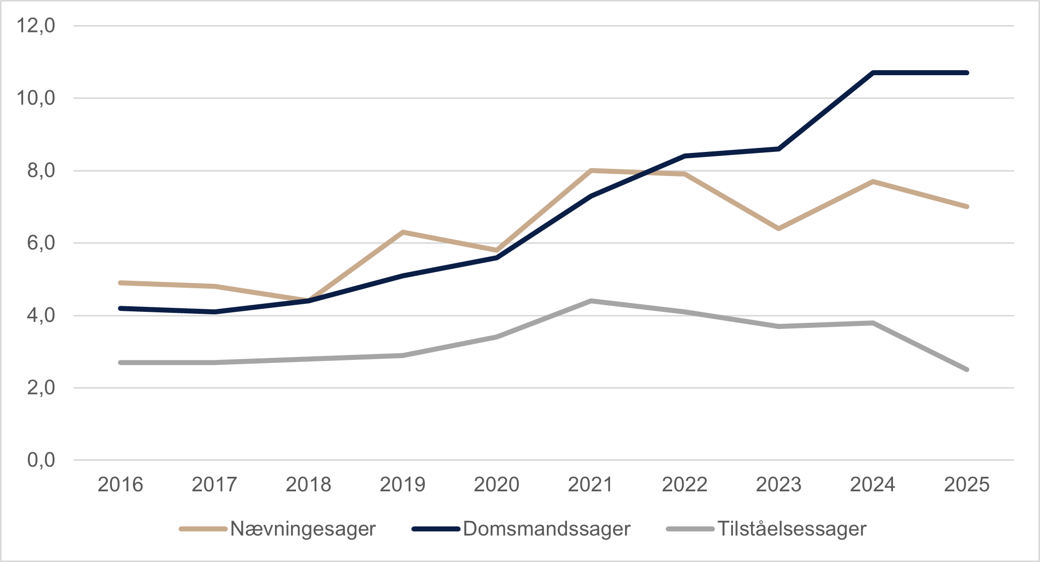 Desuden er den gennemsnitlige sagsbehandlingstid for domsmandssager begyndt at falde i 2025, så den i 4. kvartal 2025 var godt to måneder kortere end i 4. kvartal 2024.